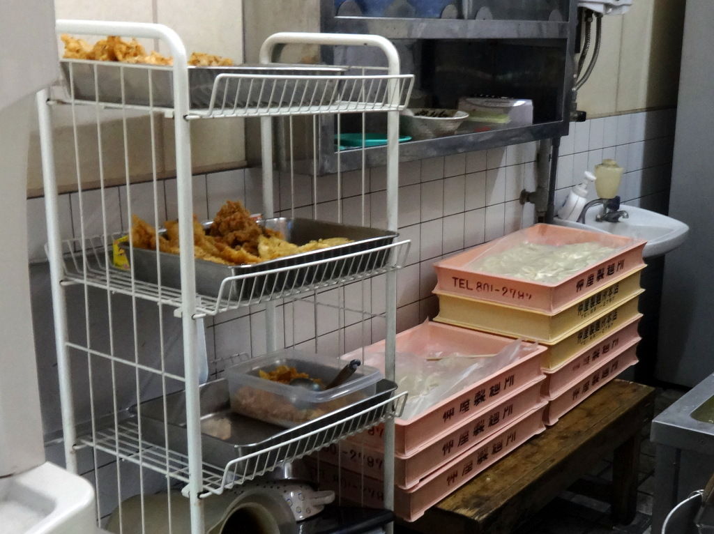 仲屋製麺所の麺箱と天ネタケース。天ぷらは発注品だそうです。メンチ売り切れにて、