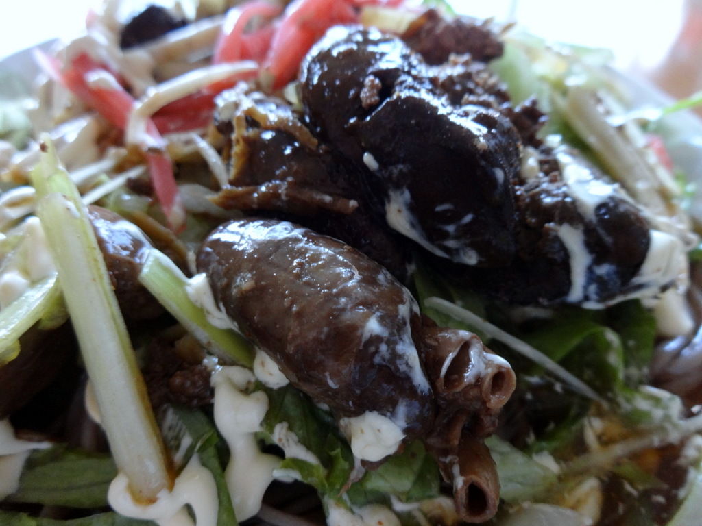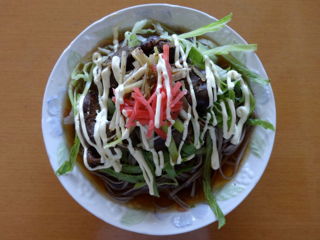 *東京かじの十割そば、創味つゆ、鶏レバー炒め、レタス千切り、短冊白ネギ、紅しょうが、マヨネーズ