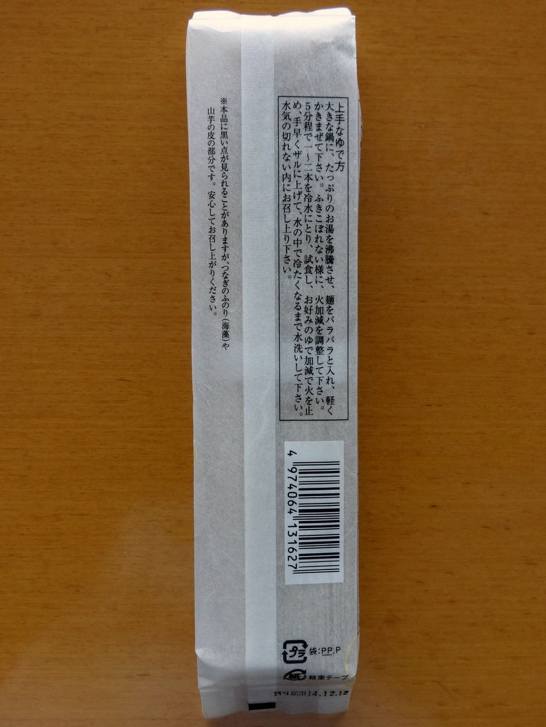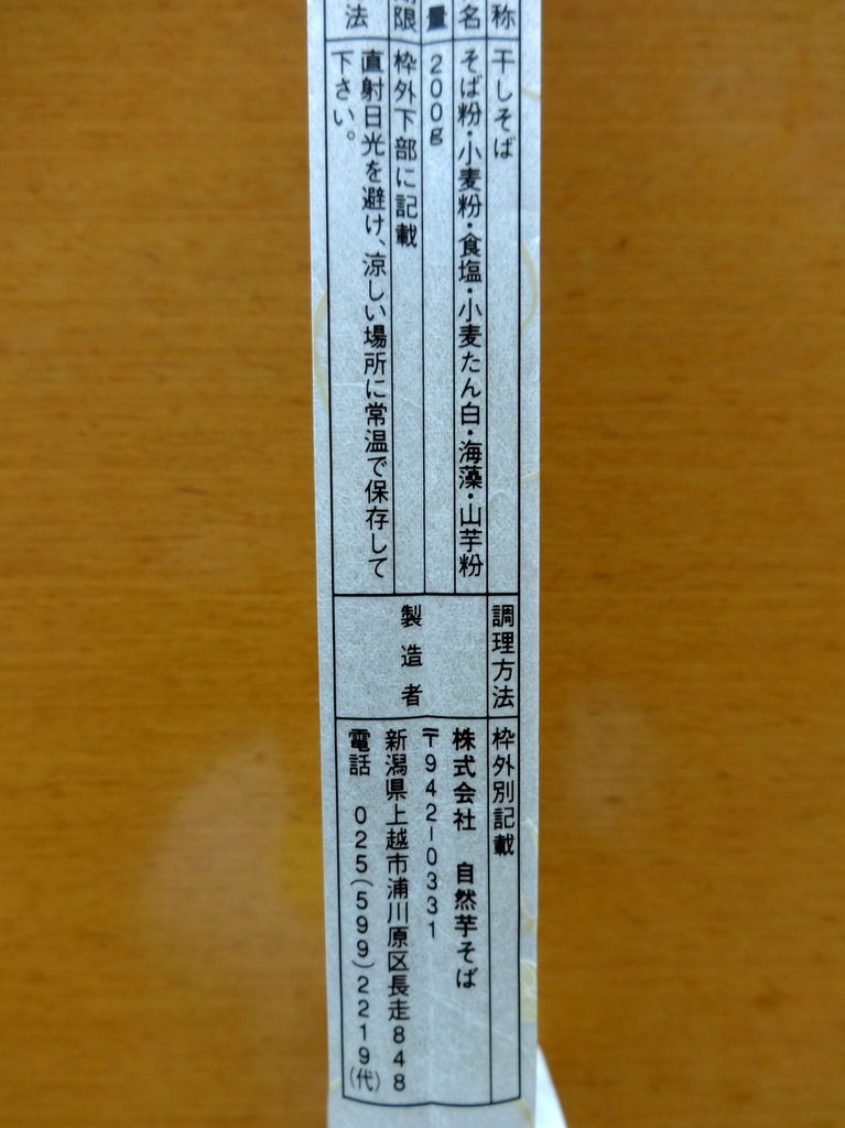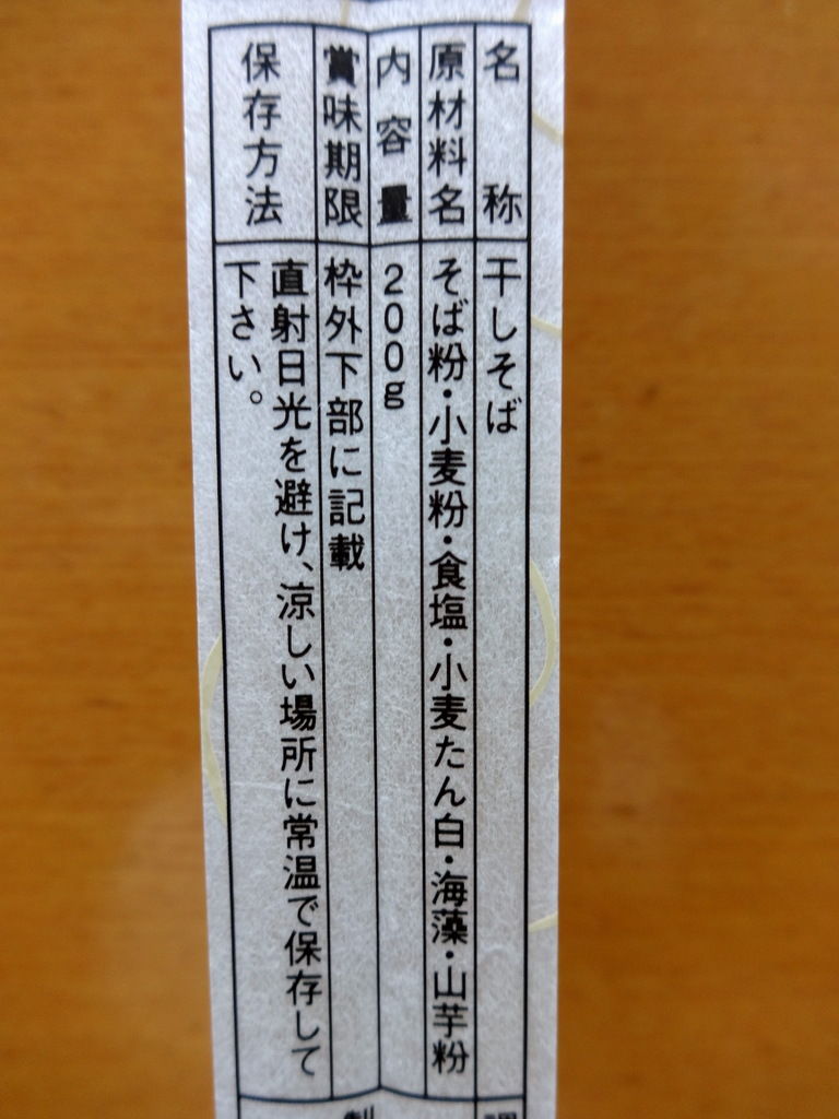そば粉・小麦粉・食塩・小麦たん白・海藻・山芋粉の表記。