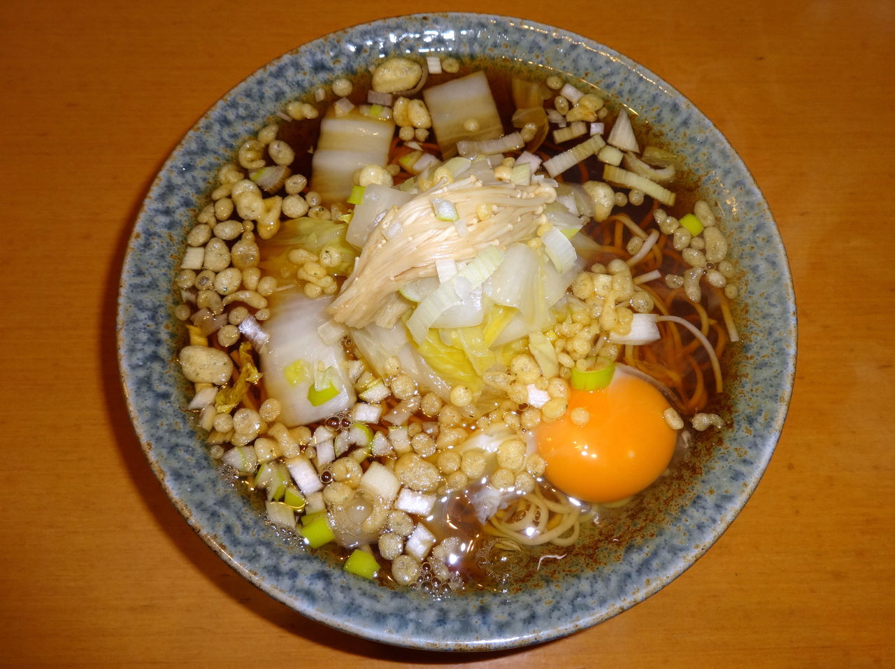 温そば、創味つゆ、白菜、えのきだけ、生玉子、ネギ、しまだやの揚げ玉。