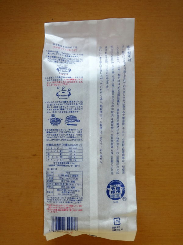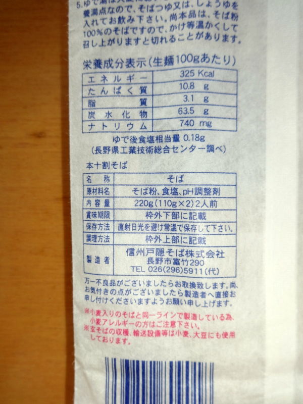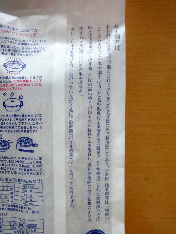 「本十割そばは本来不可能とされておりましたそば粉のみで製造いたしており、小麦粉・結着剤等は一切使用しておりません。この本十割そばは(社)長野県農村工業研究所の開発により特殊加工された新製法そば粉(圧力を掛け押し出す為、そばの高い香りが出るのが特長)を使用致し、当社技術陣の技の結集により完成されたそば粉一○○%の生そばです。おいしい本十割そばを召し上がっていただく為に、熱殺菌(ボイル殺菌)は一切行っておりません。」