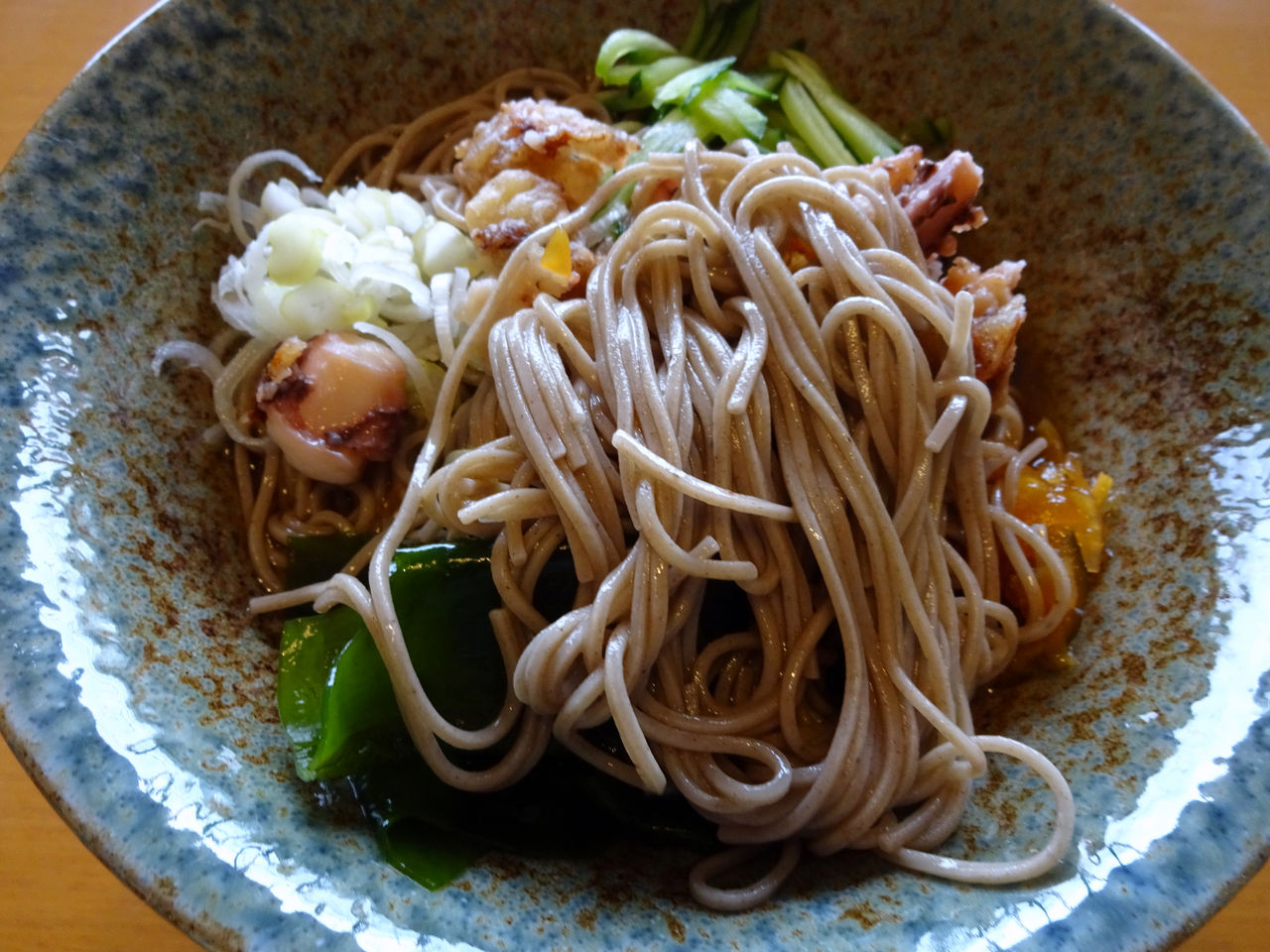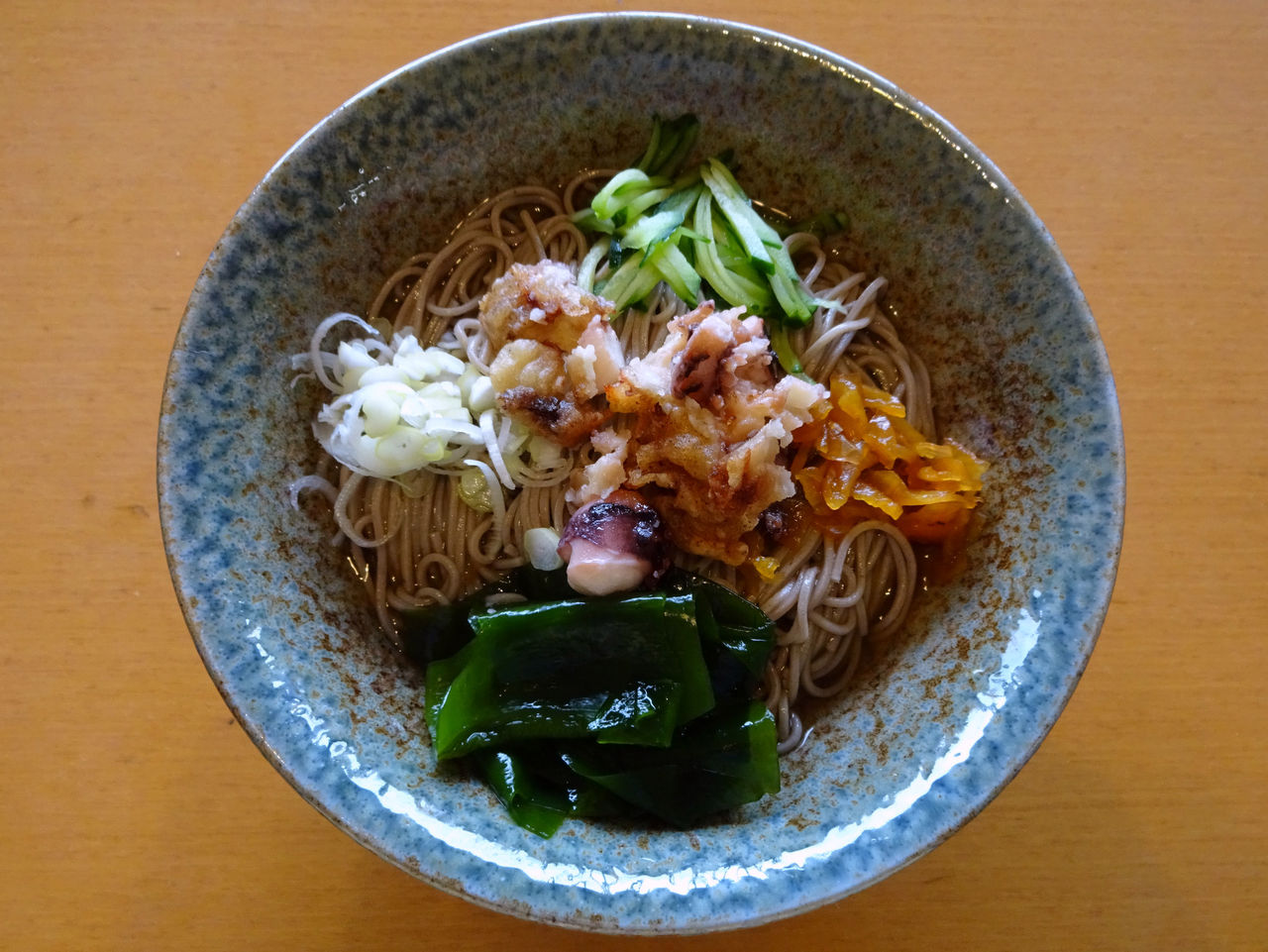創味つゆ、一由ゲソ(1ホギ程度)、わかめ、きゅうり、福神漬け、ネギ。