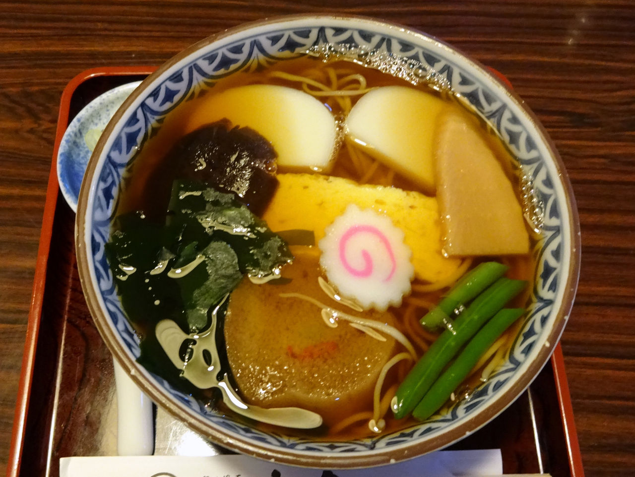 かまぼこ、お麩、煮椎茸、筍、玉子焼き、いんげん、ワカメ、ナルト、ネギは別皿。