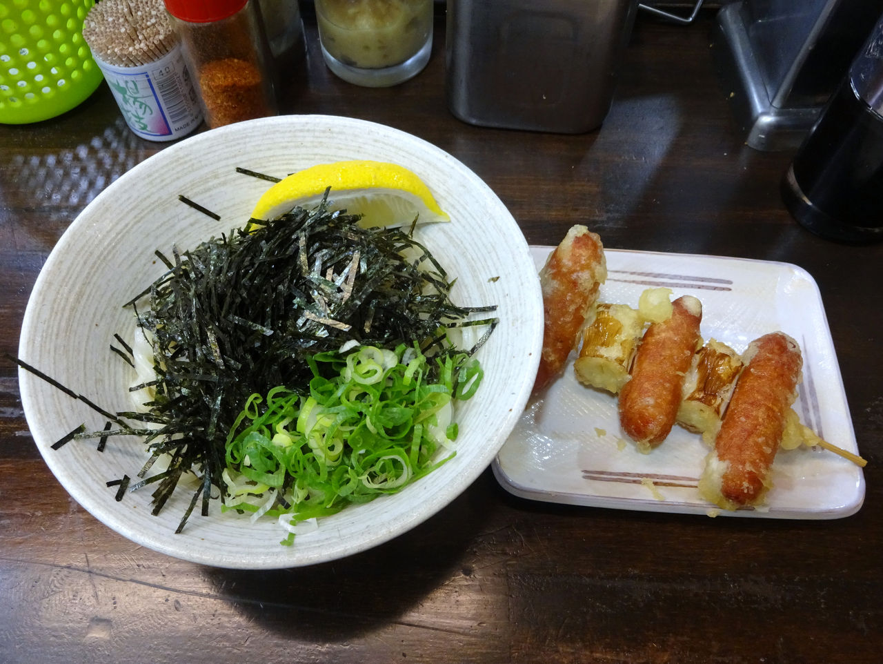 のりチーズバターうどん並580円、ネギ間チョリソー天150円です。