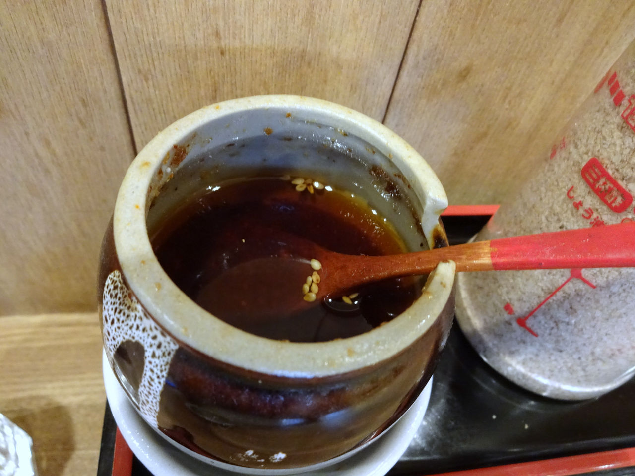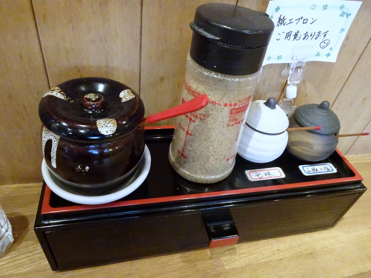 卓上調味料は、自家製ラー油、すりごま、七味、山椒塩。
