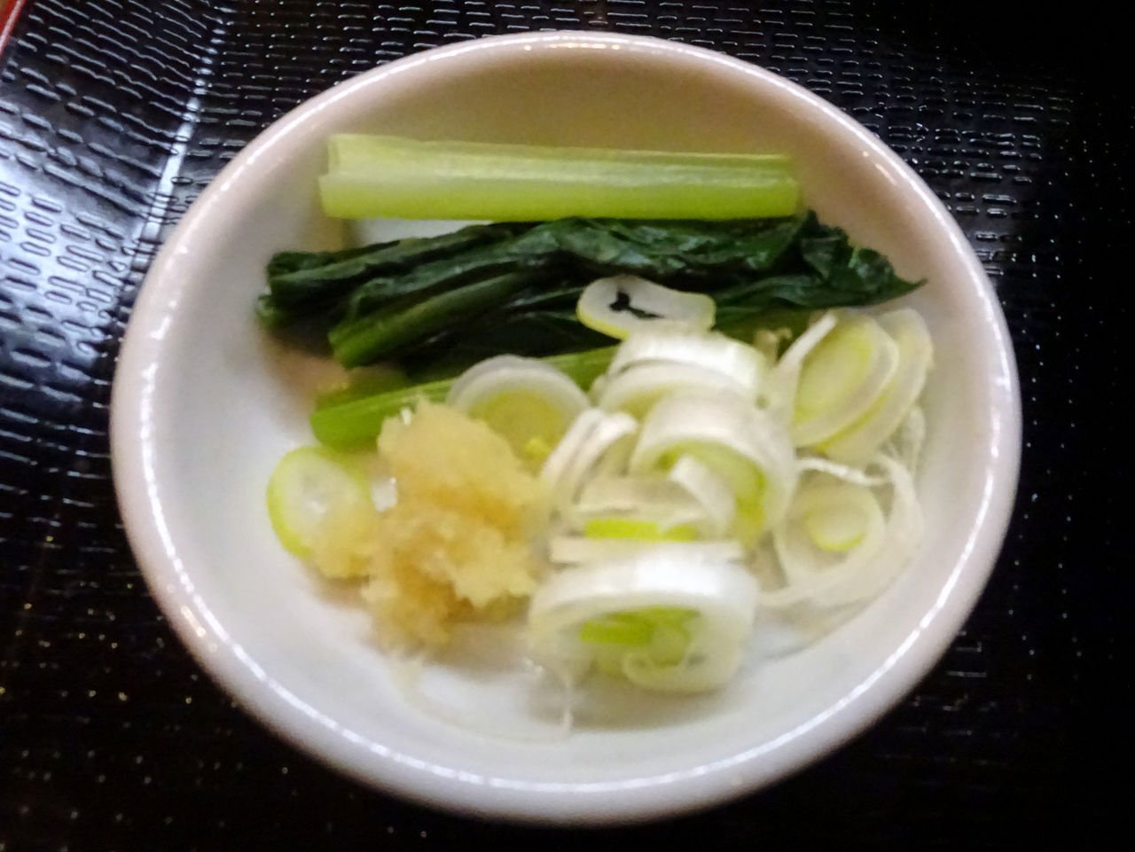 ネギ、生姜、小松菜、天かすが別皿。